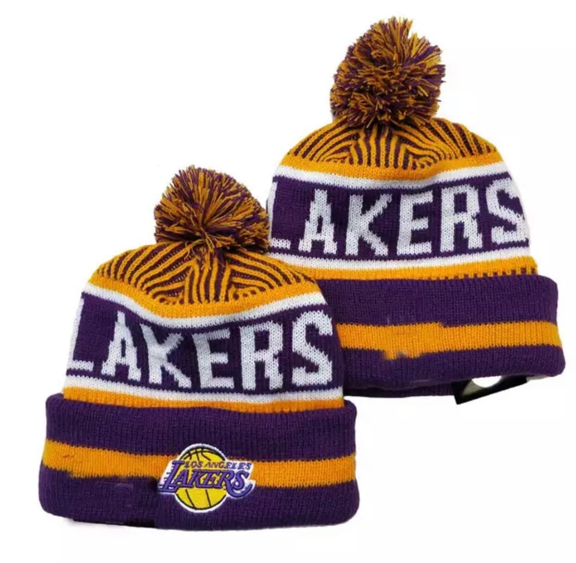 Классические Бини (Beanies): Мягкие вязаные шапки с отворотом и контрастной вышивкой «Lakers».